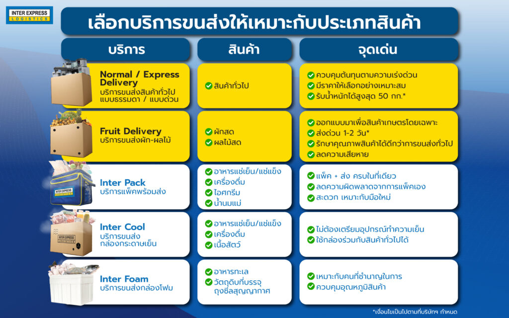รายละเอียดตามตารางด้านล่างนี้ จะช่วยให้คุณเปรียบเทียบบริการขนส่งแต่ละรูปแบบของ Inter Express และเลือกใช้ได้อย่างเหมาะสมกับสินค้า พร้อมควบคุมต้นทุนได้อย่างมีประสิทธิภาพ