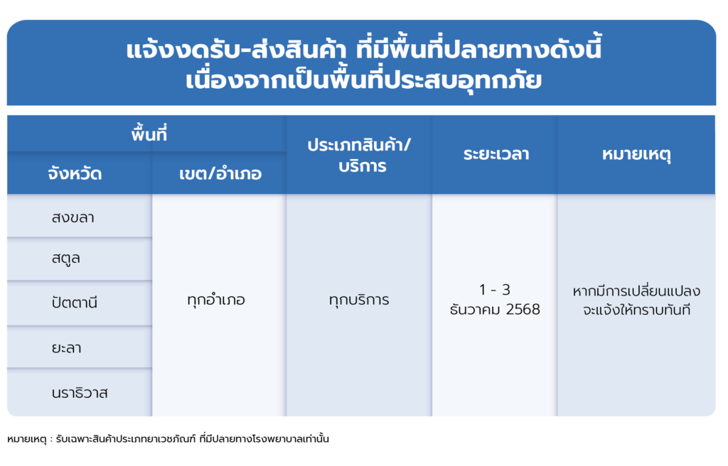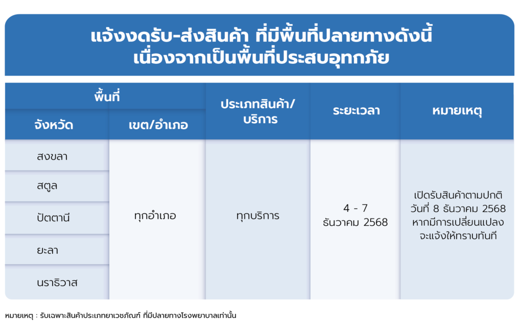 ประกาศ พื้นที่งดรับ และจัดส่งสินค้า เนื่องจากได้รับผลกระทบจากอุทกภัย