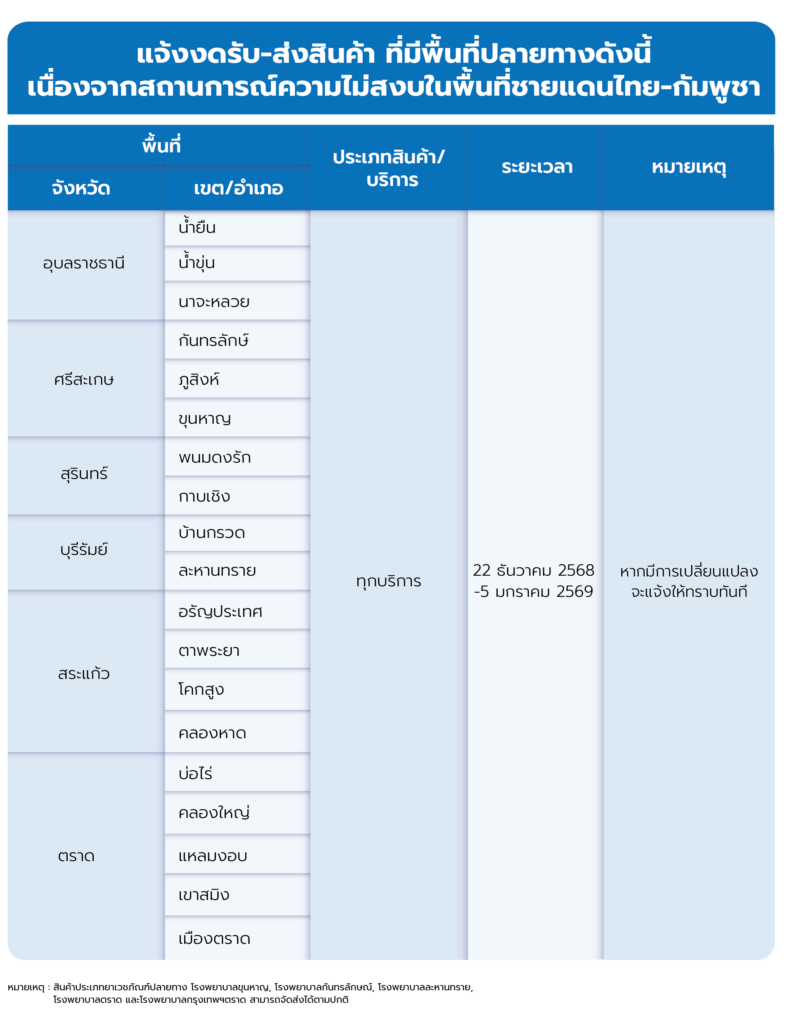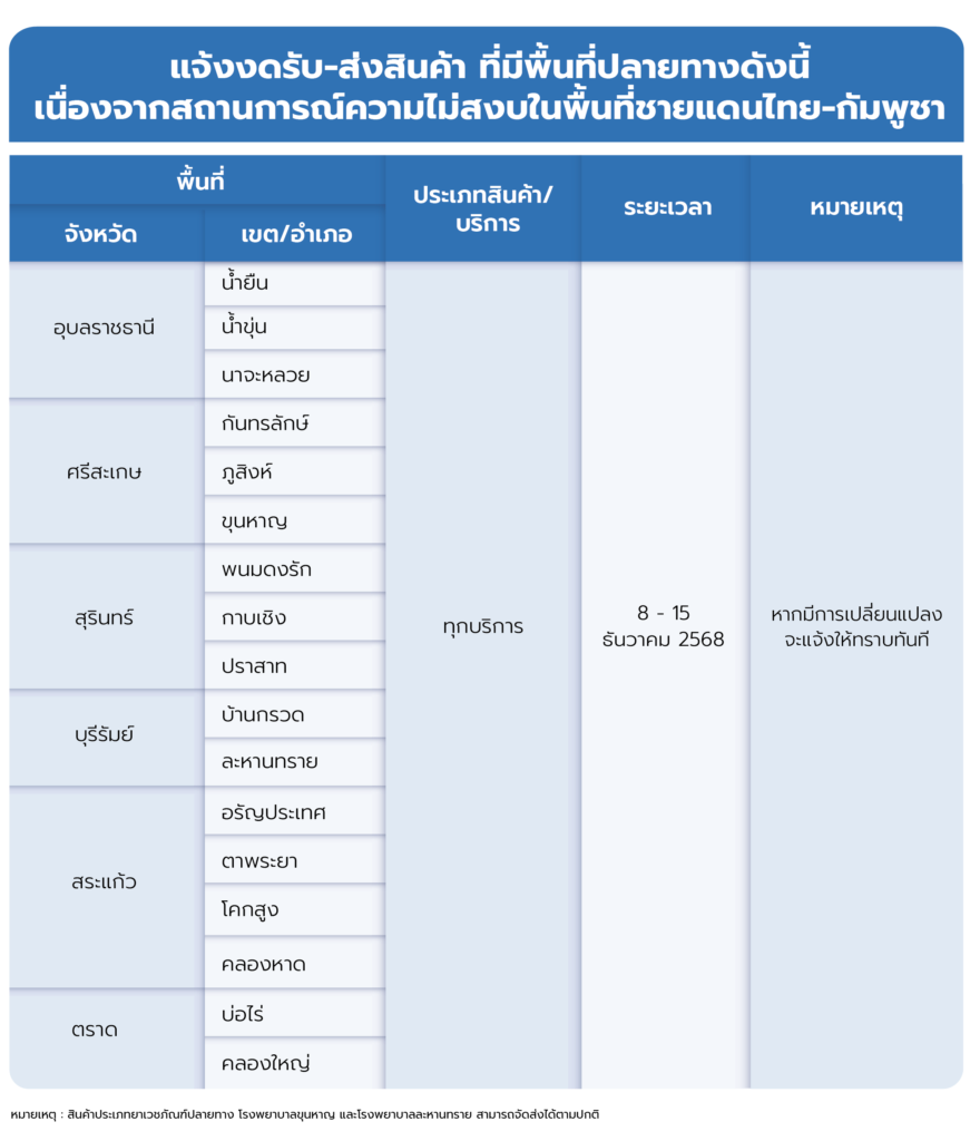 ประกาศพื้นที่งดรับ – ส่งสินค้าเนื่องจากสถานการณ์ความไม่สงบในพื้นที่ชายแดนไทย-กัมพูชา